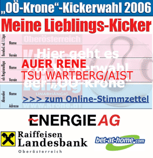 Wir gratulieren unserem Rene Auer somit zum Klassenliebling 2006 der Bezirksliga Nord. Danke an alle, die beim Stimmzettel-Sammeln bzw. Internet-Voting für unseren Rene und somit die TSU Wartberg/Aist gestimmt haben. Ihr ward großartig, ja sensationell! Die offiziellen Ergebnisse werden erst bei der Krone-Sportgala am 2.12.2006 bekanntgegeben und danach umgehend von uns auf unserer Homepage veröffentlicht.