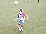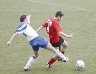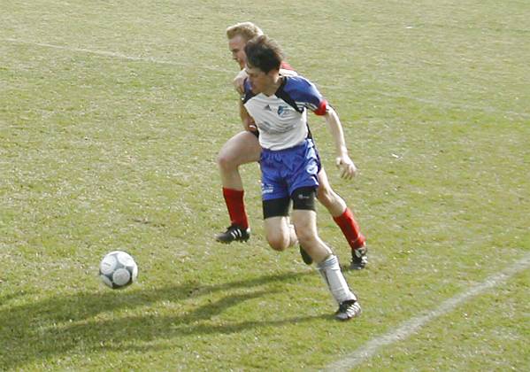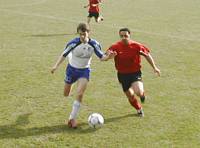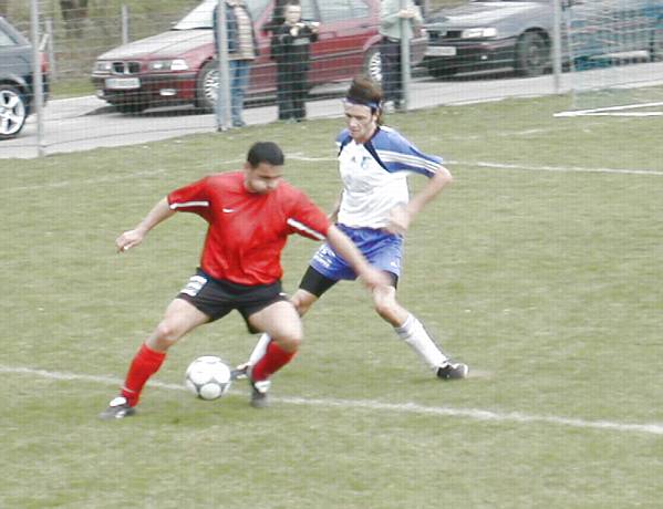 Klaus (blau-weiße Dress) im Duell mit Katsdorf's Stürmerleginär
