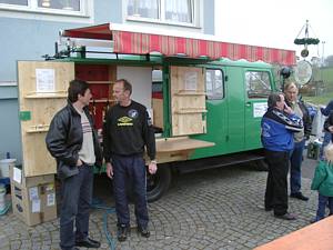 Gusi's Feuerwehrauto mit eingebauten Zapfhähnen versorgte die zahlreichen Fußballfans mit Bier vom Fass. |