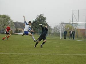 Michael "Michi" Mayrhofer flankt, doch Stefan Berndl kann vor dem heranstürmenden Torschützenführenden Thomas Stegfellner mit einer Flugparade retten. |