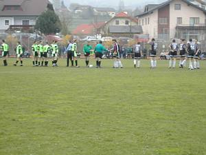 Begrüßung der beiden Teams. St. Oswald/Fr. spielt mit gelb-schwarzen Dressen, wir treten mit der grau-schwarzen neuen Auswärtsdress an, mit der wir in der Fremde bis up-to-date nur volle Erfolge feierten. |