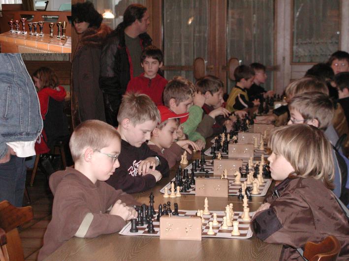 67 Kinder und Jugendliche kamen zum letzten Turnier der Turnierserie 2003/2004 um sich vielleicht doch noch fürs Masters zu qualifizieren. Die größte Gruppe waren wieder die U-10 Spieler, 33 Jungspieler versuchten dort ihr Glück. Nach dem Turnier wurde wieder jeder Teilnehmer auf eine Würsteljause und ein Getränk eingeladen. Der Bürgermeister und Hr. Innreiter überreichten den Siegern Pokale. Die Jungs vom JSV waren dabei wieder die großen Abräumer. Hr. Kammerhuber gab dann noch die Mastersteilnehmer bekannt. Das Mühlviertler Masters wird am Samstag den 24.April 2004 in Wartberg im Gasthaus Doppelhammer ( Frensdorf ) gespielt. U-15-- Schon von Anfang an verlief dieses Turnier sehr spannend. Etzi verlor gleich gegen Reichert Max und auch Markus Mörwald kam nicht auf Touren. Nur Hammer Daniel war heute seinen Gegnern überlegen und gewann mit einem ganzen Punkt Vorsprung. Unsere Gast aus Steyr musste sich mit Platz 2 zufrieden geben und David Grünzweil aus Vorderweissenbach wurde noch Dritter. Mit sehr viel Glück qualifizierte sich Lehner Gerald fürs Masters. Weil nicht anwesend, glaubte schon viele er sei heraus gefallen, aber seine Punkte bei den anderen Turnieren reichten doch aus. U-12-- Sebastian Schiefermüller führte bis zur letzten Runde. In der erwartete ihn Lumetzberger Dominik und Dominik gewann klar. Somit wurde Dominik verdient Sieger vor dem Überraschungsmann Schober Michael aus Leonfelden. Marco bezwang in der letzten Runde erstmals Judith und gewann so den Pokal für den Rang 3. Judith gewann aber die Gesamtwertung überlegen und auch Gaffl Mathias sowie Lang Tobias dürfen sich aufs Masters freuen. U-10-- Mörwald Stefan beherrschte diese Gruppe eindeutig. Er gewann jede Partie überlegen und gegen Gernot gab er nachdem er die Dame gewonnen hatte, ein Freundschaftsremis. In blendender Form zeigte sich auch David Aufreiter. Mit 5 Punkten wurde er sehr guter Zweiter. Der dritte Rang ging an Dominik Windischhofer mit ebenfalls 5 Punkte. Überhaupt wurden gleich die ersten 8 Ränge von unseren Jungs belegt. Julian Nußbaumer konnte heute gleich zweimal geschlagen werden und scheint heute nur auf Rang 10 auf. Beim Masters wird Julian aber wieder sehr gefährlich werden. Gerhard