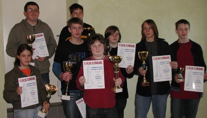 | U-15: Mit Gaffl Mathias musste ein Spieler absagen und so sprang Glasner Christoph ein. Christoph spielte enorm stark und war bis zur letzten Runde noch in Führung gelegen. Erst die Niederlage gegen Michi Mörwald konnte Christoph stoppen und so wurde es letztlich der hervorragende Rang 3. Rang 2 ging an Michael Mörwald und Sieger wurde äußerst knapp Hammer Daniel. Für Judith Buchner und Grünzweil David reichte es diesmal nicht für ganz vorne. Der JSV Mühlviertel konnte sich über einen Dreifacherfolg freuen. | |||||||||||||||||||||||||||||||||||||||||||||||||||||||||||||||||||||||||||||||||||||||||||||||||||||||||||||||||||||||||||||||||||||||||||||||||||||||||||||||||||||
