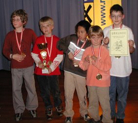 stellten wir Krenner Stephan, auf Brett 4 kämpfte Tremmel Bernhard. Am ersten Tag mussten wir gleich gegen die starken Golser antreten. Daniel zerlegt U-8 Staatsmeister Schneck, ebenso war Rene seinem Gegner klar überlegen. Leider waren Stephan und Bernhard noch etwas nervös und verloren ihre Spiele. Da aber keine andere Mannschaft einen klaren Sieg erringen konnte, war dieses Unentschieden ein gutes Ergebnis. In der Runde 2 wurde der steirische Meister mit 4:0 deklassiert und plötzlich waren wir einer der Favoriten. Auch die Salzburger konnten 3:1 besiegt werden. In dieser Runde spielte Bernhard ohne Brille und musste wegen plötzlich auftretenden Kopfschmerzen aufgeben. Mit diesem Sieg übernahmen wir die alleinige Tabellenführung. Im letzten Spiel an diesem Tag wartete nun die auf Rang 2 liegende Schule aus Wien. Auch diese Hürde wurde überraschend klar bewältigt und so wir lagen mit 3 Punkten in Führung. Frau Direktor Jax war vom Zwischenstand so erfreut, dass sie am nächsten Tag nach Imst anreiste um die Burschen moralische zu unterstützen. Wir lagen in Führung, wurden aber nicht ängstlich sondern spielten auch am zweiten Tag recht beherzt darauf los. In der Runde 5 wurden die Dornbirner mit 3:1 in die Schranken gewiesen. Unsere Gegner mischten sich gegenseitig auf, dadurch konnten wir unser Führung sogar ausbauen. Gegen die Niederösterreicher gaben wir nur ein Remis ab und so warteten in der letzten Runde des zweiten Tages die starken Tiroler. In diesem Aufeinandertreffen wuchsen unsere Jungs über sich hinaus, sie bezwangen die Telfser 4:0 Dritter und letzter Tag - wir konnten unsere Führung auf unfassbare 5,5 Punkte ausbauen. Gegen die Kärntner wollten unsere Burschen leider taktieren und so mussten wir eine Niederlage erfahren. Daniel verlor dabei auf Klappe und auch Stephan verlor recht schnell. Für Rene und Bernhard war das Remis aber nicht mehr zu ändern und so wurde dann doch etwas verunsichert die Tabelle studiert. Unsere Gegner konnte aber keine Kantersiege erringen. So war der Sieg schon vor der letzten Runde fixiert. In der letzten Runde wurde die zweite Tiroler Mannschaft 2,5:1,5 besiegt und die Freude natürlich übergroß. Alle 4 Burschen waren auch bei den Brettwertungen ganz vorne zu finden, so wurde Daniel Zweiter, Rene gewann seine Wertung und auch Stephan sowie Bernhard wurden auf Brett 3 bez. Brett 4 auf dem ausgezeichneten Rang 3 ausgewiesen. Beim abendlichen Tandemturnier waren Daniel und Rene ebenfalls nicht zu schlagen, es wurde auch diesen Spaßturnier gewonnen und unsere Burschen räumten ordentlich ab. Für die VS Pregarten ist dieser Staatsmeistertitel natürlich der größte Erfolg der Schule und wurde ausgiebig gefeiert. |